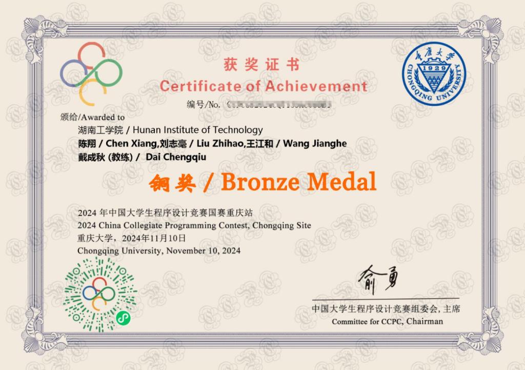 近日,第10届CCPC中国大学生程序设计竞赛(重庆)圆满结束。我校计算机科学与工程学院计算机协会成员计科2204班陈翔、软件2202班王江和、软件2203班刘志毫组成的队伍,在教练戴成秋的带领下最终荣获铜牌。